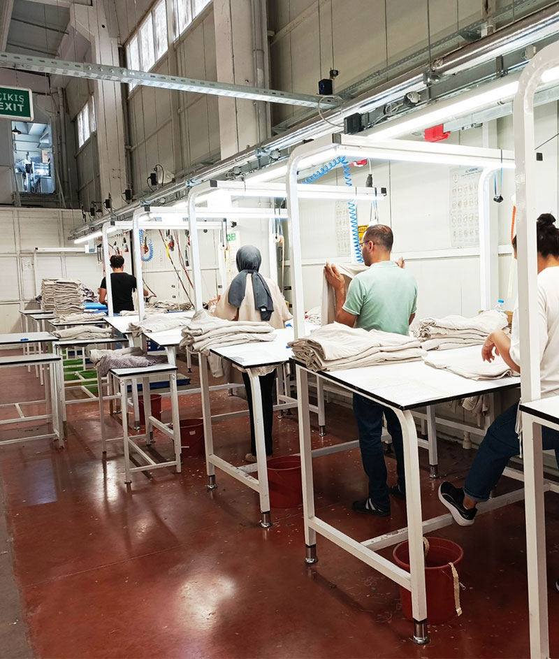 İstanbul'daki modern üretim tesisimiz, 2.300 m2'lik alan üzerine kurulmuş olup, kesimhane, konfeksiyon ve paketleme bölümlerini içermektedir. Bu tesis, aylık 60.000 ürün kapasitesiyle sektördeki talepleri karşılamak adına sürekli çalışmaktadır. Malatya'daki 3.200 m2'lik fabrikamız da kesimhane, konfeksiyon ve paketleme bölümleriyle donatılmış olup, aylık 40.000 ürün kapasitesine sahiptir.